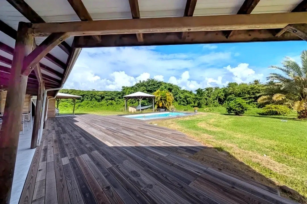Découvrez cette magnifique maison en bois de type T5, idéalement située à Goyave, dans le secteur très prisé de Sarcelle, avec un accès direct à la plage.